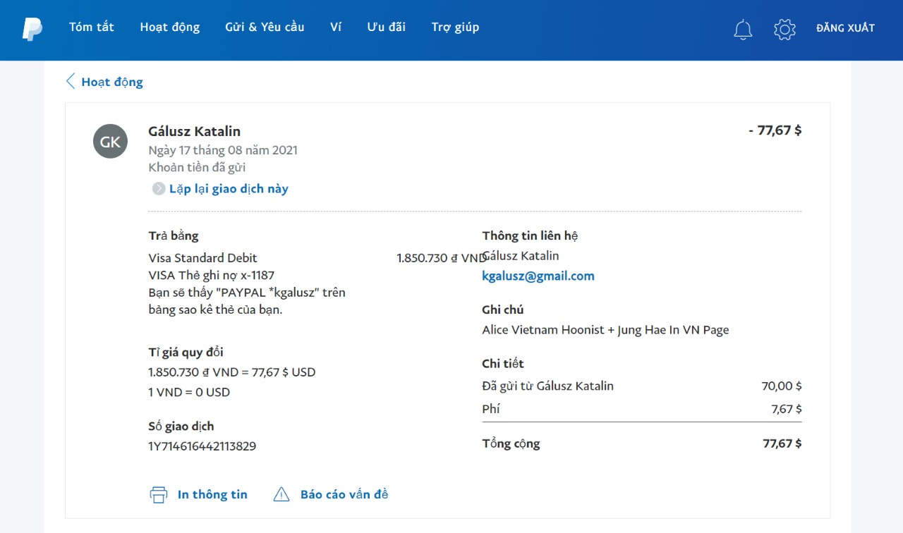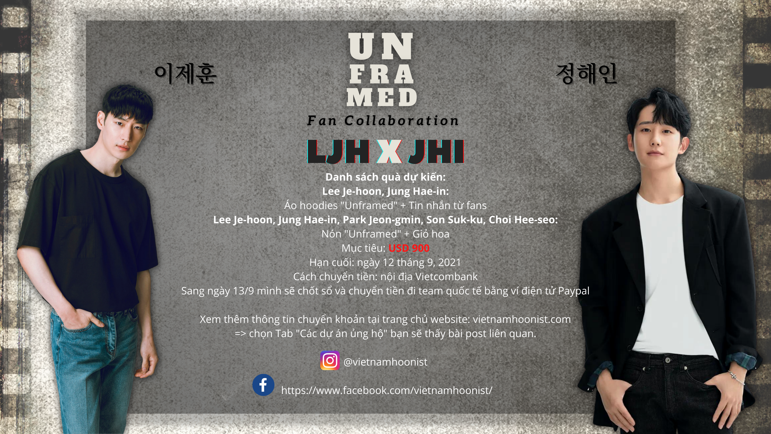 Một số lưu ý cần biết: sau khi nhận được tiền của các bạn, mình sẽ dùng tài khoản Paypal để chuyển khoản cho đại diện team quốc tế Lee Je-hoon + Jung Hae-in. Tiền khi được chuyển khoản từ Việt Nam sang quốc gia khác sẽ mất phụ phí chuyển khoản và chênh lệch tỷ giá. Vì vậy, tổng tiền mà team quốc tế nhận được sau cùng sẽ ít hơn một phần (sau khi đã trừ phí chuyển tiền + chênh lệch tỷ giá). Mọi hoạt động liên quan đến chuyển tiền, tỷ giá tại thời điểm thanh toán sẽ được công khai và cập nhật trực tiếp vào post này để các bạn theo dõi.