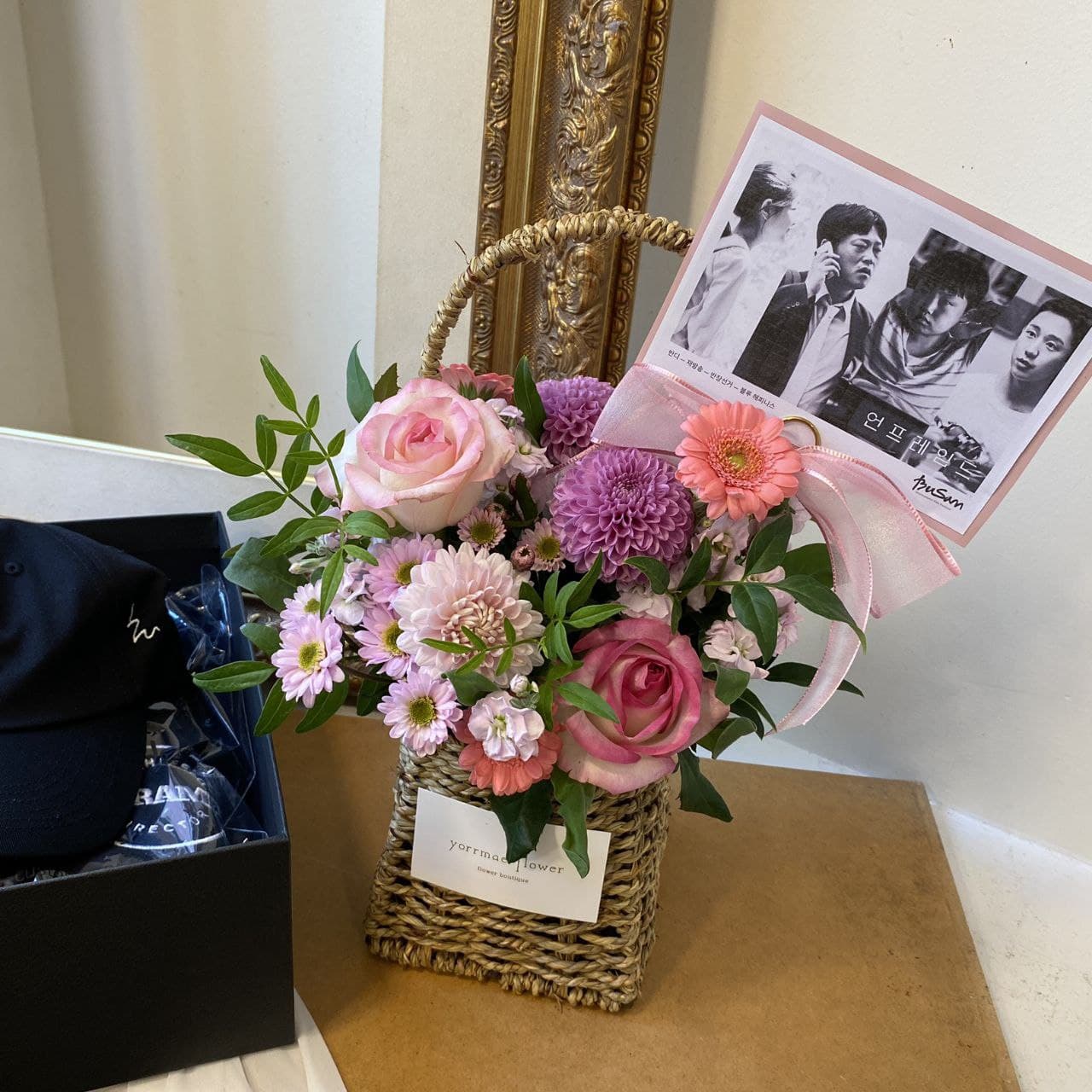 Choi Hee-seo (theme hồng): nón Unframed, áo hoodie Unframed, giỏ hoa.